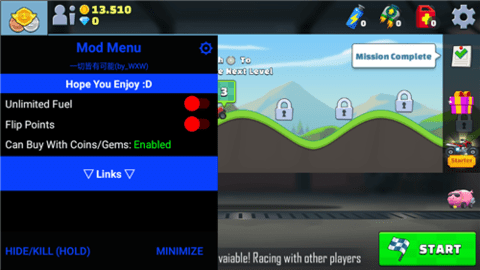登山赛车越野竞速功能菜单版是一款充满挑战与乐趣的越野竞速游戏。玩家将驾驶各种越野车辆,在复杂多变的地形中展开激烈角逐,既要保持车辆平稳行驶,又要争取以最快速度抵达终点。游戏经过大神修改,特别内置了作弊菜单功能,为玩家提供无限金币、钻石和油量等资源,大幅提升游戏体验,让玩家能够尽情享受越野驾驶的乐趣。