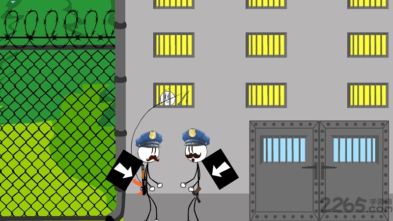 4、卡通画风融入黑色幽默元素。失败动画中火柴人被抓住时的夸张表情,以及警卫追捕时的滑稽动作,都能缓解游戏紧张感。