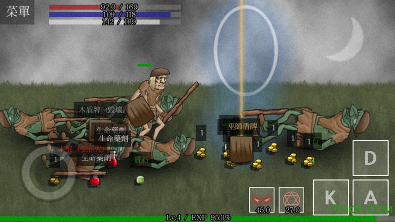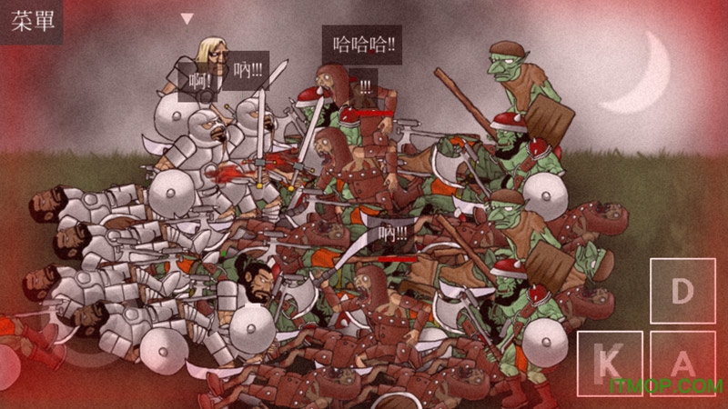 横版的动作游戏,就是一关一关的战斗,游戏就只有踢倒、攻击、防御三个键,运用得当就可以无损击败敌人【贼难啊……】,非常有挑战性,打死敌人会掉装备和金币……