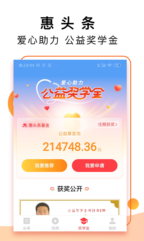 惠头条极速版是一款集新闻阅读与收益获取于一体的资讯软件。它整合了头条新闻、短视频、公益奖学金等丰富内容板块,让用户在获取最新资讯的同时还能赚取零花钱。软件采用智能推荐算法,为用户精准推送个性化内容,打造专属的阅读体验。无论是热点新闻追踪、趣味视频观看,还是参与公益项目,都能在这里一站式完成。这款软件将知识获取与收益回报完美结合,是您日常生活中不可或缺的资讯伴侣。