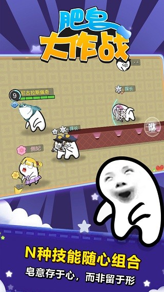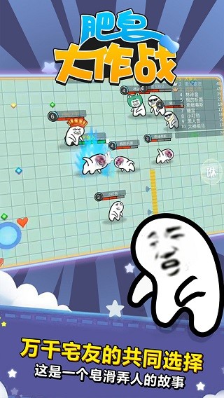 肥皂大作战正版是一款充满欢乐与创意的休闲竞技游戏。游戏以独特的澡堂为背景,玩家将在这里展开一场别开生面的肥皂争夺战。搞笑的剧情、魔性的角色造型以及丰富的表情包元素,让整个游戏过程充满欢声笑语。你可以与众多玩家同场竞技,通过灵活组合多种技能来制定专属战术。无论是肥皂投掷还是闪避走位,都需要你全神贯注。游戏采用清新简约的线条画风,搭配夸张的人物动作,为玩家带来轻松愉快的游戏体验。