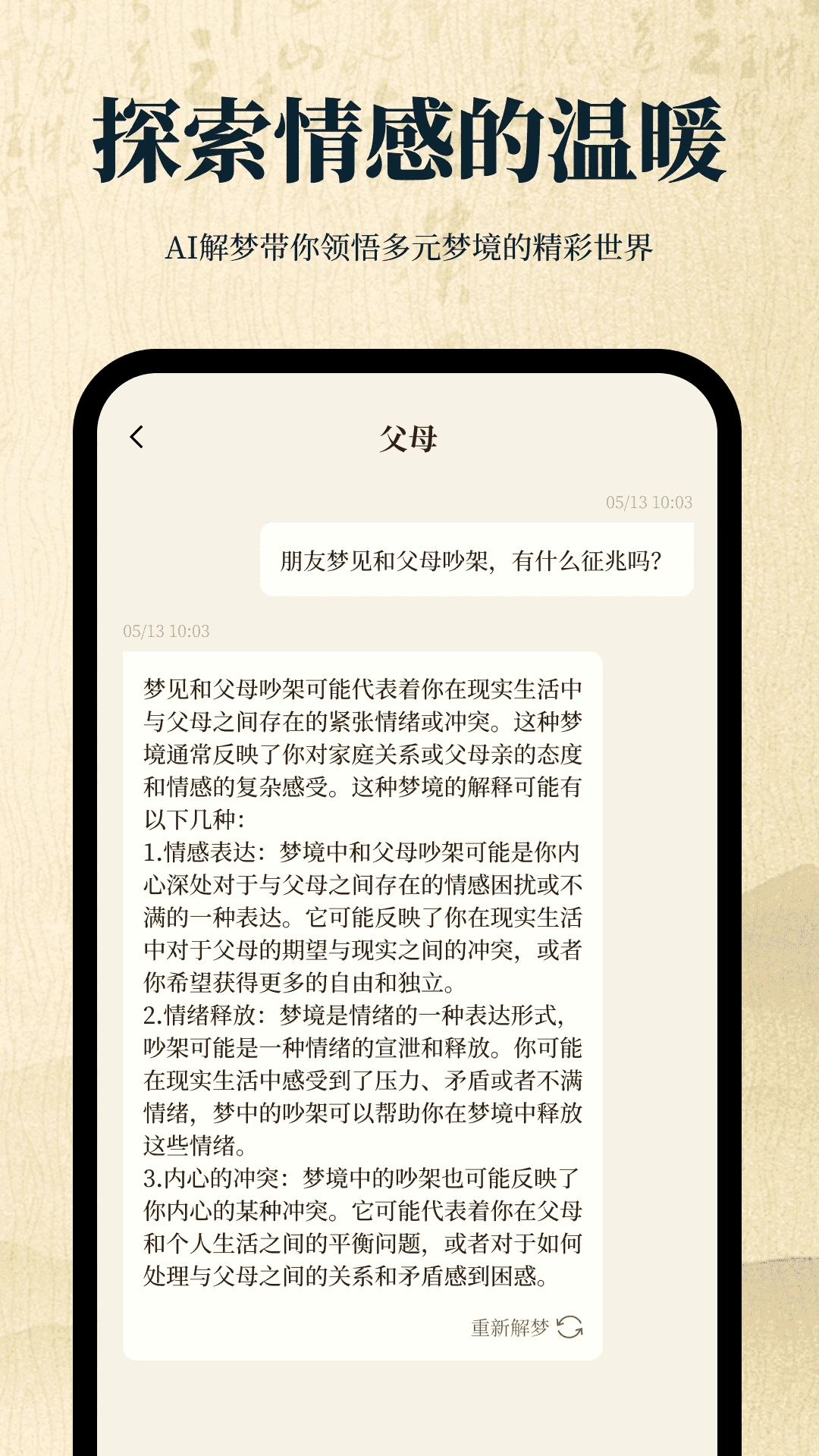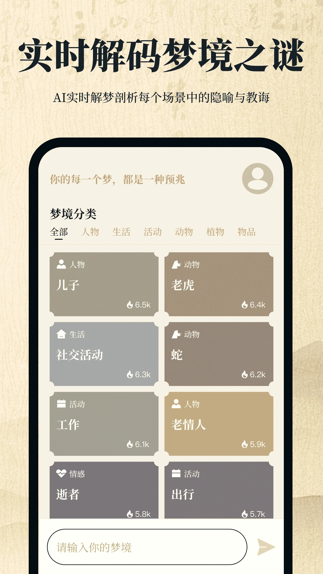 无论是梦见植物动物、亲人、自然灾害、活动还是生活用品,我们都能为您提供深入的解读和分析!针对儿童用户推出"童话梦境"专属模式,用安全友好的方式解析梦境,并生成睡前安抚故事帮助缓解噩梦影响。