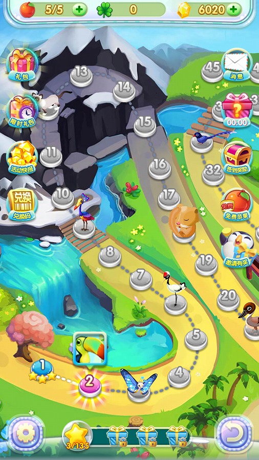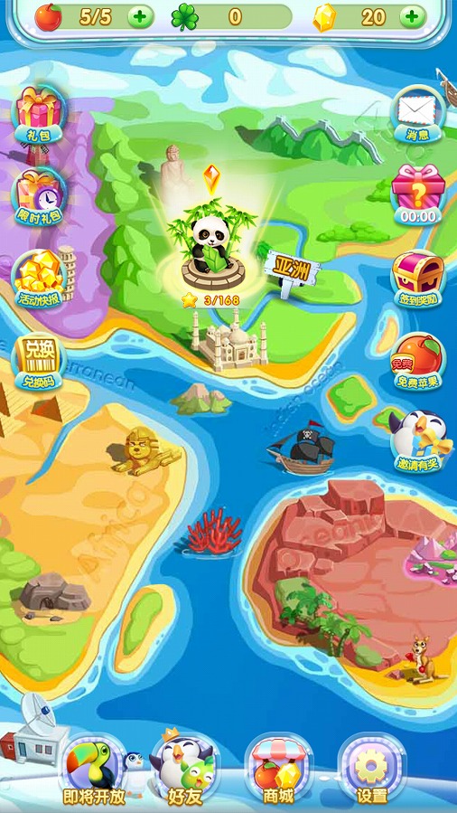 精致UI,世界各异!游戏界面设计充分体现了各地域特色,每个大洲的关卡都融入了当地的自然风貌和文化元素。在南极关卡中,玩家需要突破厚重的冰层;非洲关卡则要应对流动的沙丘;热带雨林区域会出现生病的小动物,需要玩家通过消除来帮助它们恢复健康。这些精心设计的细节让游戏更具代入感。