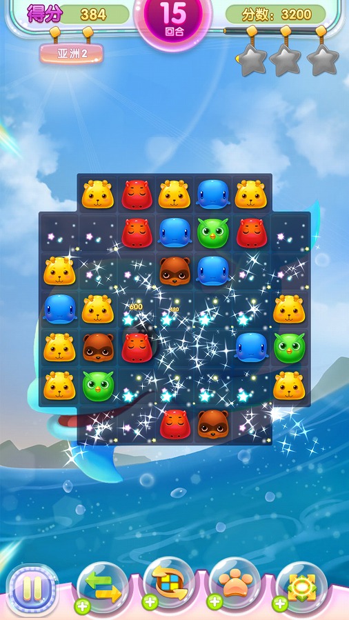 动物大招,各具特色!游戏创新性地加入了动物联消大招系统。当玩家成功将5只相同动物连成一线时,会触发该物种的特殊能力。比如老虎大招可以让周围的小猫一起消除,这个设计不仅增加了游戏趣味性,还能启发家长给孩子讲述"小猫是老虎师傅"的寓言故事,寓教于乐。