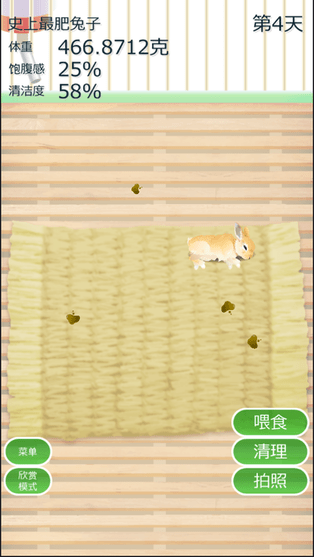 本作是一款简单的放置型兔子养成游戏。养育方法非常简单,至少每4天给它喂食1次,每周清理1次笼子就行了,然后看着它一点点长大。建议新手优先升级饲料槽,这样可以延长自动喂食时间。当兔子心情值较低时,可以通过抚摸或提供玩具来提升。随着亲密度提高,兔子会解锁更多互动动作,比如会主动跳到玩家怀里撒娇。定期给兔子拍照还能获得额外奖励。