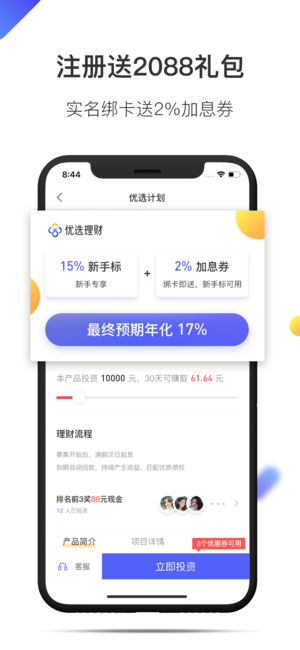 优选理财APP作为国资战略控股的互联网金融平台,始终秉持安全稳健的经营理念。平台采用银行存管模式,严格实行资金同卡进出制度,确保用户资金安全无忧。新用户注册即可享受专属福利,实名认证并绑定银行卡可获赠2%加息券。平台产品期限灵活多样,收益透明可见,历史兑付率始终保持100%。无论是短期资金周转还是长期财富规划,都能在这里找到合适的理财方案。