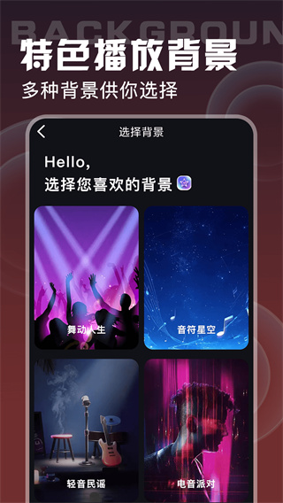 4、精心设计的音乐背景主题,包含舞动人生、音符星空等十余种风格,用户可以根据歌曲类型自动匹配或手动选择。这些动态背景会随着音乐节奏变化,带来视觉与听觉的双重享受,提升整体使用体验。
