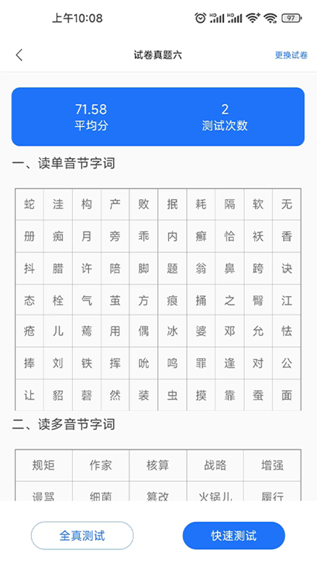 2、结合国家普通话水平考试标准,帮助用户更好地备考。软件提供全套模拟试题和专项训练,让用户熟悉考试流程,掌握应试技巧,提高考试成绩。