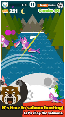 1、核心玩法是快速切割飞出的鲑鱼,玩家需要用手指在屏幕上划动,像武林高手一样精准斩击。注意要在鲑鱼掉落前完成切割,连续成功切割可以获得连击加分;