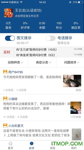 在线诊疗:认证医师可开通个人问诊室,接收来自全国各地的宠物主咨询,平台提供病例转介和收入结算服务。