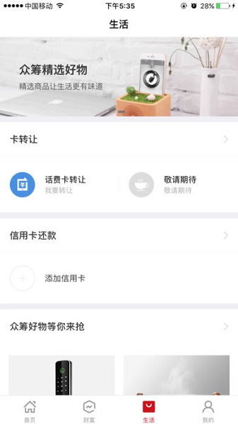 提供便捷的卡转让、信用卡还款、众筹等生活金融服务。卡转让功能支持快速转账,手续费优惠;信用卡还款支持多家银行,操作简单快捷;众筹平台则为有梦想的用户提供展示创意的机会。此外还整合了水电煤缴费、手机充值等便民服务,真正实现一站式生活金融解决方案。