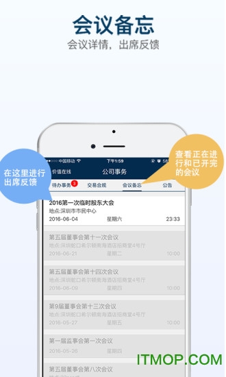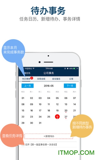 1.董事会、监事会、股东大会,公司三会情况即时可看,支持历史会议记录回溯和未来会议智能提醒。