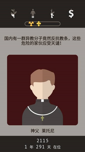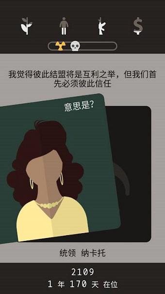 游戏操作简单直观,只需按住卡牌向左或向右轻划即可查看不同选择及其对四项国家指标的影响。将卡牌完全划出屏幕即确认选择。需要注意的是,看似微小的决策可能在游戏后期产生重大影响,因此建议玩家在每次选择前都慎重考虑。
