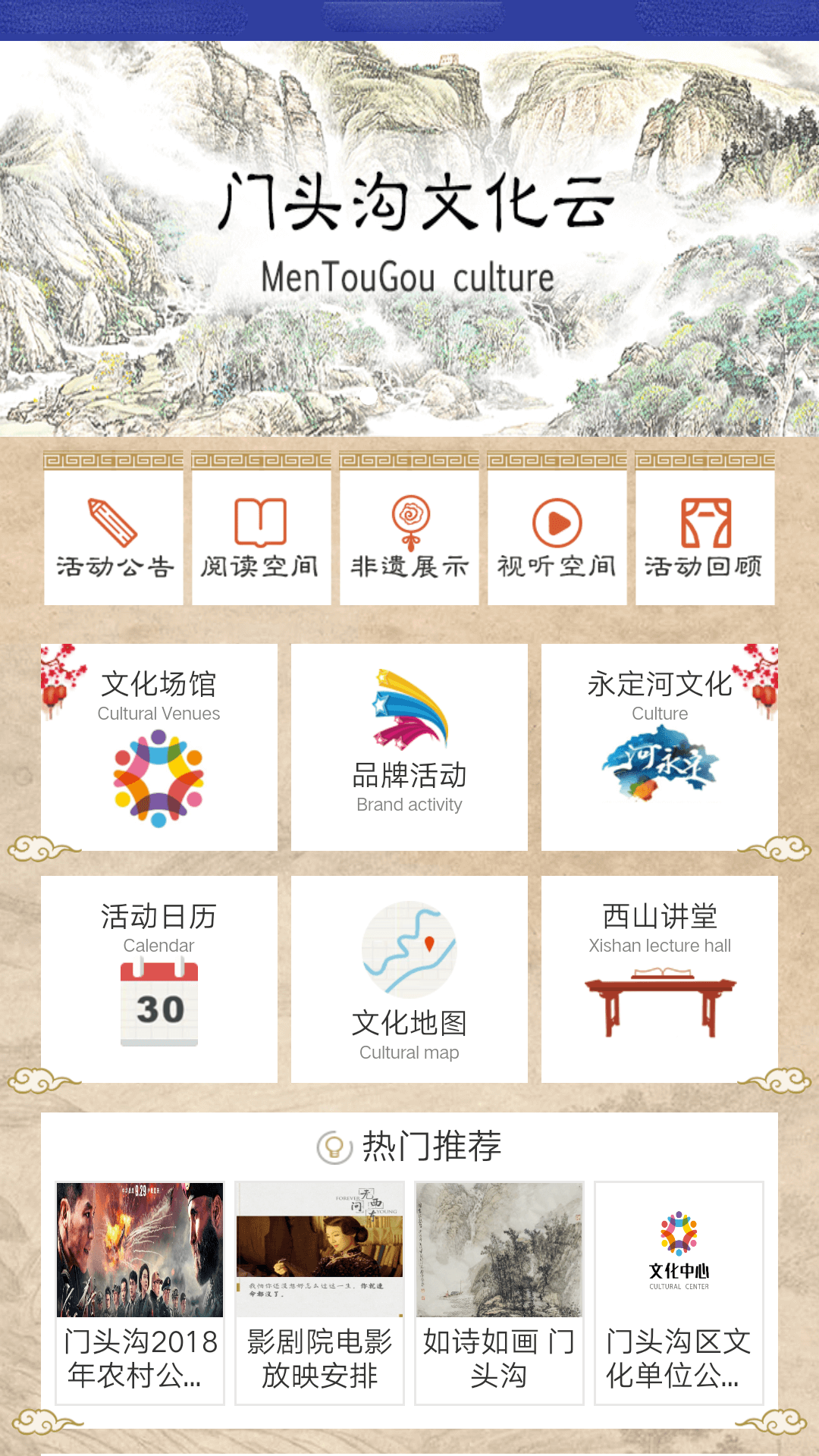 门头沟文化云实现了资讯发布、服务提供和应用整合。包含活动公告、阅读空间、非遗展示、视听空间、活动回顾、文化场馆、品牌活动、永定河文化、活动日历、文化地图、西山讲堂、热门推荐、猜你喜欢13个模块。每个模块都经过精心设计,比如非遗展示模块收录了门头沟区丰富的非物质文化遗产项目,通过图文、视频等形式生动呈现;文化地图模块则整合了全区文化场所信息,提供导航、预约等实用功能。平台还特别开发了智能推荐系统,根据用户浏览习惯和兴趣偏好,个性化推送相关内容,让文化服务更加贴心。