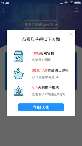 2、用户可通过购买、做任务获得蛋鸡所需要的食物、水、药物等,使蛋鸡健康快乐的成长。平台提供多种任务形式,包括每日签到、邀请好友等,让您在娱乐中积累养殖资源。