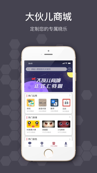 【大伙儿商城】:这里有丰富多样的可运用到晓乐机器人上面的应用,表情,音色,它们可以帮您打造出与众不同,专属于您的晓乐机器人。商城定期更新内容,包括节日主题皮肤、趣味音效包等,让您的机器人始终保持新鲜感。