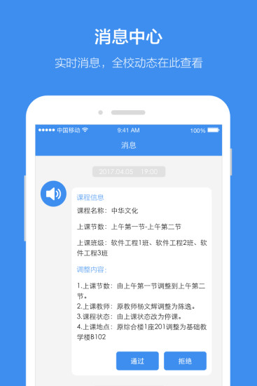 学生端支持按日/周/月视图切换课表,实时同步教务系统变更数据,自动提醒课程调整信息。教师端提供可视化调课界面,可查看教室占用情况并提交调课申请,系统智能检测冲突并推送审批流程,实现课表管理的智能化与协同化。