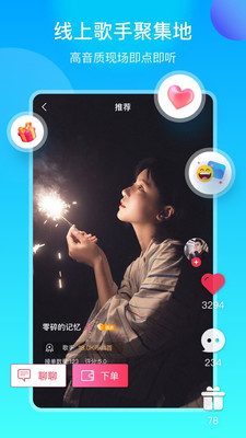 3.线上歌手聚集地。高音质现场即点即听;独创的"即时演唱会"模式,支持用户与歌手实时互动点歌。平台拥有上万首正版伴奏资源,配合专业音效处理,打造堪比现场的听觉体验。