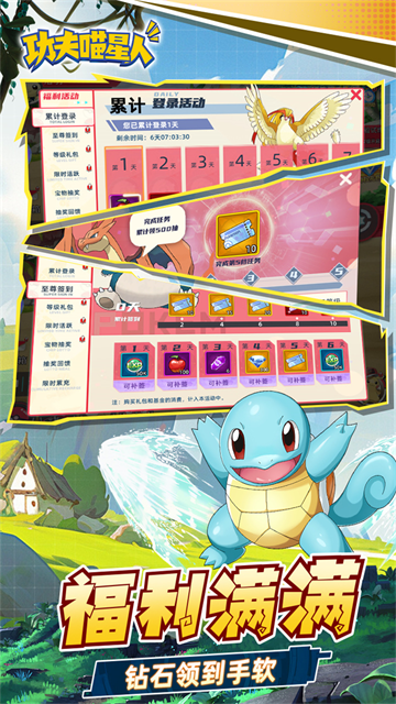 2、登录奖励中包含了价值丰厚的礼包,其中红色品质的水箭龟是前期非常强力的水系宝可梦,搭配赠送的100张抽奖券,可以让玩家快速组建强力战队。建议优先培养水箭龟,它的群体攻击技能在前期推图时非常实用。