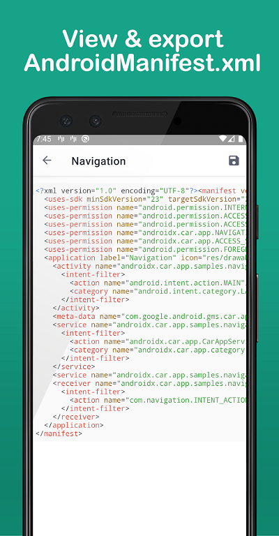 ·带有保存选项的完整版AndroidManifest.xml。支持多种格式导出,保留原始文件结构。