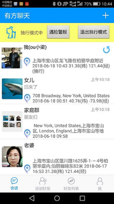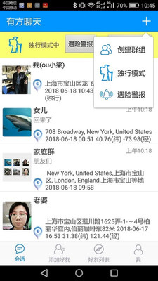 有方聊天严格限制社交范围,每位用户最多只能添加9位好友,加入不超过6个群组,确保使用场景仅限于亲密家人之间。添加好友时需要输入完整的用户名进行精确搜索,避免陌生人误加。系统会自动保存用户及好友最近50条位置记录,超出部分会自动清理,同时支持用户手动永久保存重要位置信息。应用提供多项特色功能:"遇险警报"可在紧急情况下向所有好友发送求助信息和实时位置,并支持一键报警;"独行模式"会实时将用户的位置变动推送给指定家人;"停止定位"功能则采用独创的倒计时恢复机制,既保护隐私又不违背软件设计初衷。定位服务采用第三方技术,每4分钟在前台运行时更新一次,后台自动停止定位,充分尊重用户隐私权。