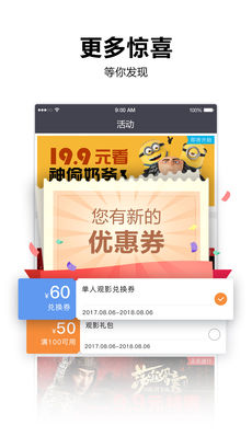 3、实时更新全国影院排期信息,第一时间推送限时特惠、首映礼等特别活动通知;