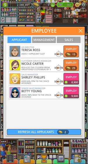 游戏的核心玩法围绕商店经营展开,你需要从数百名应聘者中筛选出最适合商店发展的人才。根据业务淡旺季变化,灵活调整用工策略,在销售高峰期确保充足人手,在淡季控制人力成本。通过持续的员工培训和岗位优化,打造高效专业的服务团队。