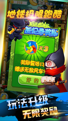 《地铁极限跑酷》是一款充满速度与激情的3D动作跑酷手游,以其独特的玩法和炫酷的技能特效为玩家带来前所未有的游戏体验。游戏中你将化身身手敏捷的忍者,在充满挑战的赛道上展现飞檐走壁的绝技,躲避各种障碍物,收集珍贵道具。丰富的竞技模式让你尽情挑战极限,更有海量奖励等你来拿。流畅的操作手感搭配精美的画面表现,让每位玩家都能享受到最纯粹的跑酷乐趣。现在就加入这场刺激的冒险之旅吧!