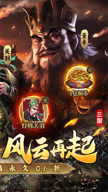 武圣关云长是一款以三国为背景的放置类卡牌养成手游,巧妙地将历史与幻想元素相结合,为玩家呈现出一个策略与冒险并存的世界。在这里,你可以收集并培养众多三国名将和美人,每位角色都拥有独特的技能和属性,让你在轻松挂机的同时体验养成的乐趣。游戏不仅还原了三国时期的经典战役,还加入了丰富的策略玩法,让你在运筹帷幄中挑战各路势力,感受排兵布阵的智慧。此外,武圣关云长0.1折版更是为玩家带来超值福利,永久0.1折充值折扣让你畅享游戏乐趣,快来开启你的三国之旅吧!