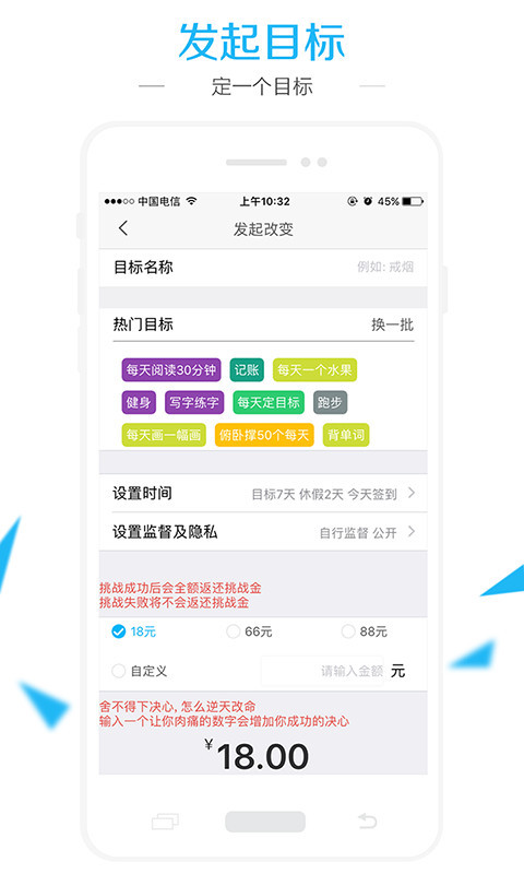 你是否总是因为忙碌的生活而无法实现自己的目标?是否常常把梦想一拖再拖,最终变成遗憾?《达目标》是一款专为自律人士设计的手机应用,它能帮助你通过公众监督和激励机制,真正落实每一个计划。无论是健身、学习还是戒除不良习惯,这款应用都能让你告别拖延,用行动证明自己。通过押金挑战、每日签到和社群互动,你将获得持续的动力,让目标不再只是空谈。现在就加入《达目标》,开启你的蜕变之旅!