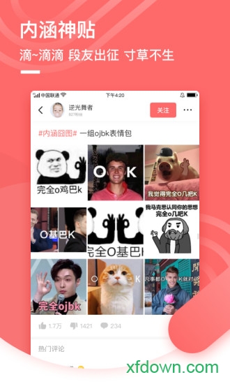 每日精选推送各类爆笑段子,让你随时都能开怀大笑;海量搞笑图片库,总有一张能戳中你的笑点;关注你喜欢的搞笑达人,不错过他们的每一篇精彩内容;参与热门话题讨论,畅所欲言地吐槽,释放生活压力;一键分享有趣段子给好友,让快乐传递;在其他用户的内容下发表神评论,展现你的段子手实力,成为社区里的焦点人物。
