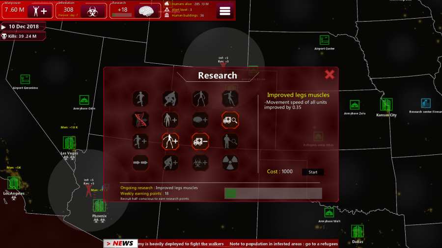 作为僵尸指挥官,您需要在美国全境精心策划病毒传播策略。从最初的零星感染开始,逐步发展成席卷全国的僵尸狂潮,最终摧毁人类最后的防线。游戏提供7种各具特色的僵尸类型,每种都拥有独特的进化路线和战斗特性。您需要合理调配资源,既要维持僵尸军团的扩张速度,又要防范人类军队的反扑。特别要注意医疗团队的病毒研究进度,必须在他们研制出解药前彻底瓦解人类文明。游戏中的每个决策都将影响末日进程,考验玩家的战略眼光和资源调配能力。