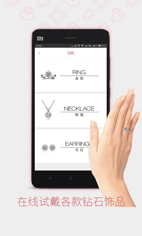 1、自动保存每次试戴记录,生成专属爱情时间轴,记录情侣选购钻戒的甜蜜历程。2、提供定制刻字服务,可将爱情宣言镌刻在钻戒上,打造独一无二的爱情信物。3、除钻戒外还包含项链、手链等200+款珠宝配饰,一站式满足女性珠宝需求。