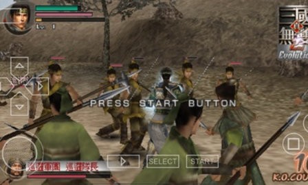 □键普通攻击随武器等级最高可连击6次,持有进化武器时无双槽满更可施展9连击。△键蓄力攻击(C技)可派生多种强力招式,○键无双乱舞在槽未满时可长按蓄力。X键实现骑乘系统,靠近马匹或战象即可上下坐骑。L键兼顾防御与视角调整,R键觉醒攻击需积攒专用槽位,效果媲美PS2版354系列。START键可暂停查看战场态势,△键在移动阶段可调出包含存档功能的情报菜单。游戏初期提供易/普通/难三档难度,通关后解锁「激难」模式,敌人攻击力堪比354系列的修罗难度。