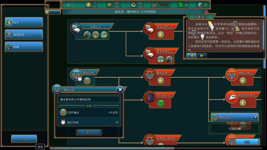 2.您可以为您的国家选择不同的发展计划或福利政策;从重商主义到计划经济,从军国主义到和平发展,多种治国路线任君选择,每种路线都会带来截然不同的游戏体验。
