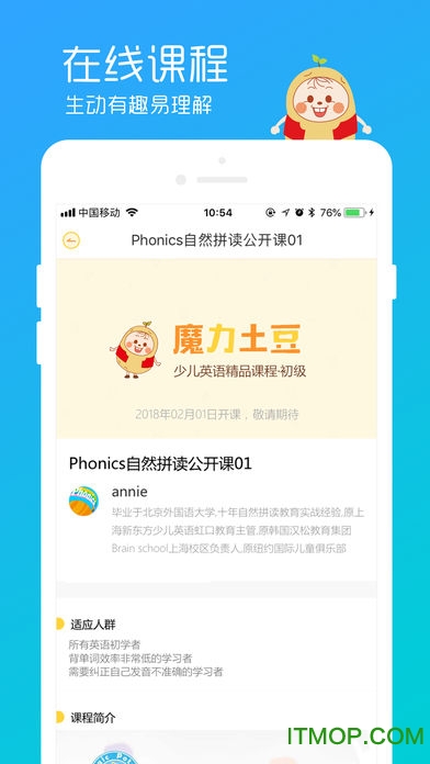 魔力土豆手机客户端是一款专为儿童英语启蒙打造的互动学习应用,通过生动有趣的动画课程和互动游戏,帮助孩子在轻松愉快的氛围中掌握英语。应用采用情景式教学法,以主角魔力土豆的日常生活冒险为主线,将英语学习融入真实场景,激发孩子的学习兴趣。无论是零基础的英语启蒙,还是想要提升听说读写能力,魔力土豆都能提供适合不同年龄段孩子的课程内容,让学习英语变得简单又有趣。