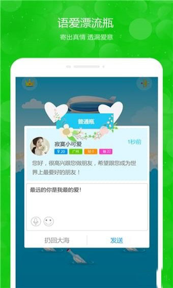 《语爱漂流瓶》是一款充满浪漫与惊喜的社交软件,它以独特的漂流瓶玩法为核心,为用户打造了一个自由表达情感的交友平台。在这里,你可以像投掷漂流瓶一样,将自己的心事、愿望或爱意封装成语音或文字,让缘分为你找到那个对的人。平台汇聚了各具魅力的真实用户,无论是寻找知心好友还是浪漫伴侣,都能满足你的社交需求。简洁清新的界面设计搭配流畅的互动体验,让每一次交流都充满期待与乐趣。