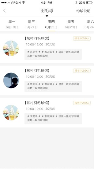 3)约球圈是平台的特色社交功能,打造了以运动为主题的互动社区。用户可加入不同场馆或运动项目的专属圈子,分享运动心得、装备评测、技术交流等内容。系统会根据用户的运动偏好智能推荐可能感兴趣的圈子和球友。通过发布动态、参与话题讨论,用户可以结识更多志同道合的运动伙伴。约战功能支持发起或响应各类运动挑战,系统会自动匹配时间地点,让组队运动变得简单高效。平台还定期组织线下活动,为用户创造更多面对面交流的机会。