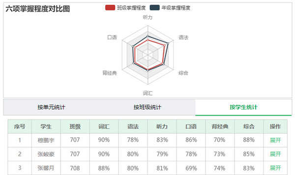 外语通会将每份作业中学生对各个知识点的熟练度数据同步至“六大模块”,便于老师了解学情,并根据学生对知识点的掌握程度进行深度教学,方式如此: