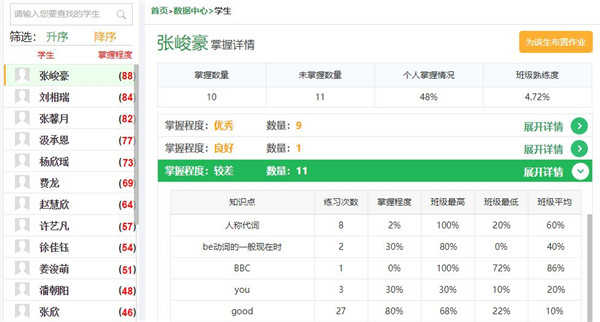 学生提交作业后,老师可通过查看各学生的掌握详情,了解该学生在作业中的失分点及掌握较差点,为其布置个性化作业,巩固基础