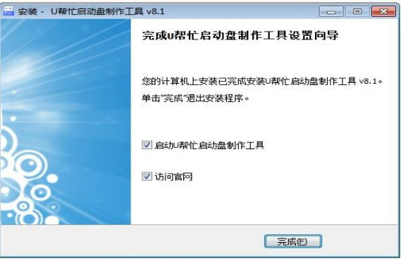 安装需要一些时间,请耐心等待,安装完成后勾选“启动U帮忙U盘启动盘制作工具”,再单击“完成”;