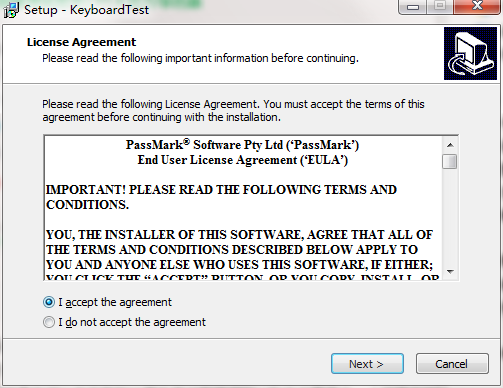 在本站将keyboardtest(键盘测试软件)下载下来,并解压到当前文件夹中,点击其中的keytest.exe应用程序,进入许可协议界面,我们需要选择我同意然后点击下一步。