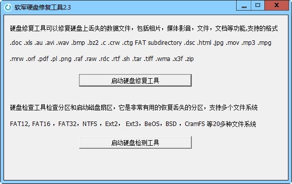 2,硬盘修复工具可以修复硬盘上丢失的数据文件,包括相片,媒体影音,文件,文档等功能。支持的格式,如:.doc .xls .au .avi .wav .bmp .bz2 .c .crw .ctg FAT subdirectory .dsc .html .jpg .mov .mp3 .mpg.mrw .orf .pdf .pl .png .raf .raw .rdc .rtf .sh .tar .tiff .wma .x3f .zip