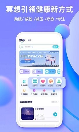 2.冥想纯音乐:精选多首专业制作的冥想音乐,配合语音引导,帮助用户快速进入深度冥想状态,获得最佳放松效果。
