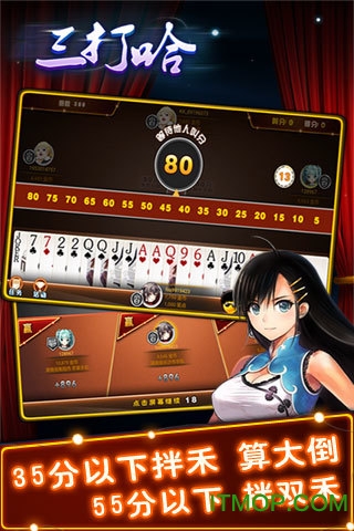 "三打哈"是一款起源于湖南地区的经典扑克游戏,现已风靡全国,在不同地区也被称为"三打一"。游戏使用两副扑克牌,去掉3和4,固定以7为主牌。王、2、7为常主,每局发牌后留有8张底牌。游戏由四人参与,通过叫分确定庄家,其余三人组成闲家团队。闲家需要通过抓取5、10、K等分值牌来累计分数,共同对抗庄家。游戏融合了叫分、扣底、保底等多种玩法元素,既考验个人牌技又强调团队配合,是一款兼具竞技性和娱乐性的扑克游戏。
