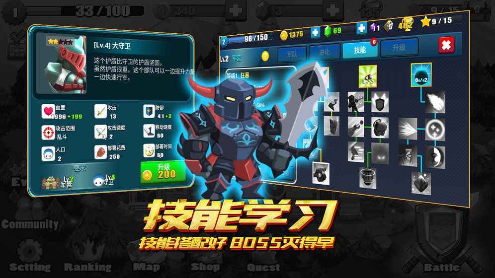 塔防竞技玩法:天梯模式采用实时匹配机制,玩家需要在限定时间内完成防御布局,系统会根据防守成功率、资源利用率等多维数据生成竞技评分,赛季排行榜前100名可获得限定皮肤。