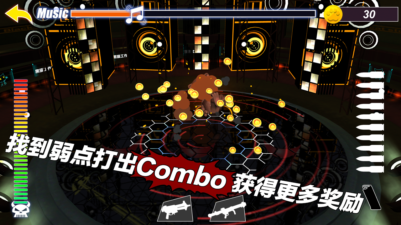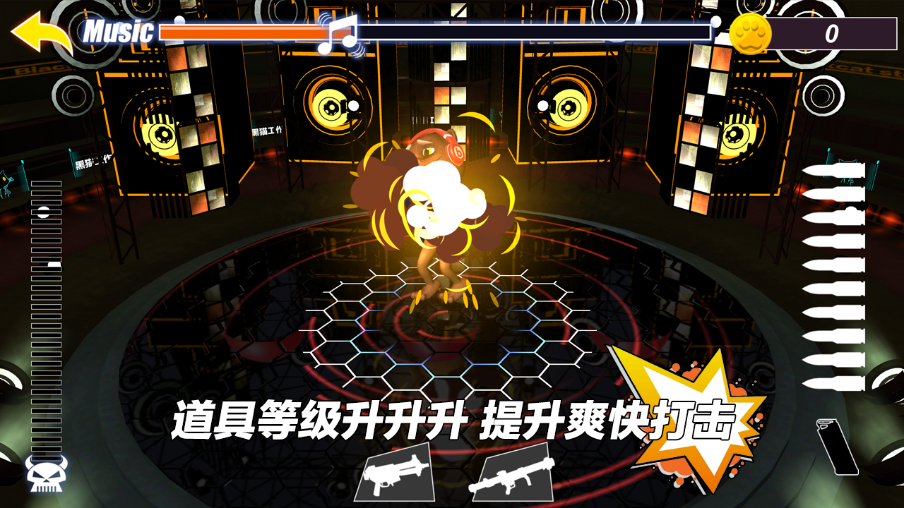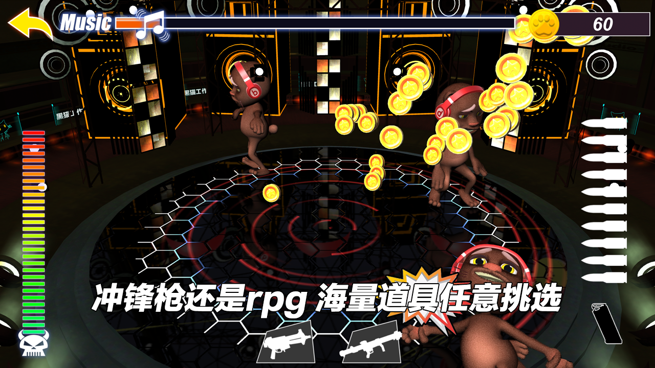 游戏最大的亮点在于小黑猫那令人捧腹的"爆炸舞技"。虽然它自诩为才华横溢的舞者,但实际表演时常常左脚绊右脚,各种意外摔倒的场面层出不穷。更让人哭笑不得的是它永不气馁的精神,无论被击倒多少次,只要还有体力就会立即爬起来继续表演。游戏提供了极其丰富的武器系统,从普通的冲锋枪到夸张的RPG火箭筒应有尽有,完美满足玩家各种发泄需求。随着游戏进程,小黑猫会穿上各种奇怪装备来防御,这时玩家就需要升级武器才能继续有效阻止它。游戏还设计了丰富的关卡内容,后期"黑猫天团"的其他成员会陆续加入这场午夜狂欢,让挑战变得更加有趣而富有变化。