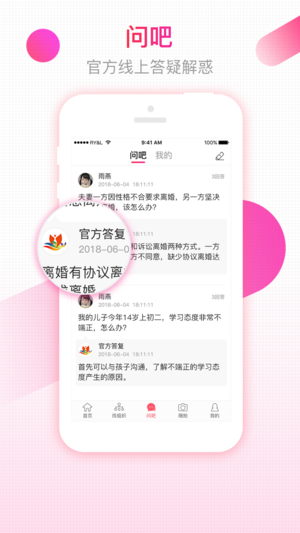 问吧板块:组建由法律、心理、教育等领域专家构成的顾问团,提供7×12小时在线咨询服务。