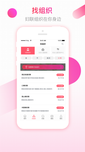 找组织板块:提供全省各级妇联组织联络方式,方便用户查询活动信息、寻求帮助支持。