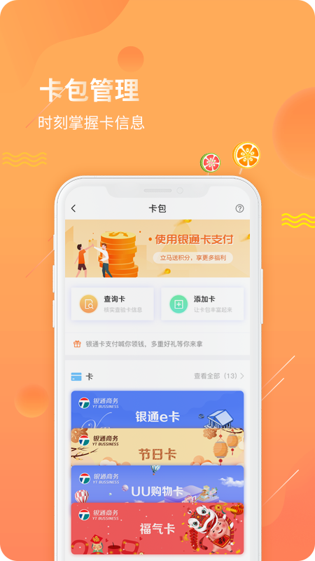 UU购物卡app是一款功能强大的预付费卡管理工具,由银通商务精心打造,致力于为用户提供一站式的卡片管理解决方案。通过这款应用,您可以轻松绑定各类预付卡,实时查询卡内余额,快速搜索周边合作商户,并享受专属优惠折扣。无论是日常消费、生活缴费还是积分兑换,UU购物卡都能满足您的多样化需求。应用界面简洁直观,操作便捷流畅,更有贴心的会员服务和安全保障,让您的每一笔消费都更加省心、放心。现在就下载体验,开启智能化的卡片管理新生活!
